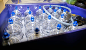 Applying cups of plastic or silicone material on the skin to create a vacuum. This vacuum is created by using a mechanical pump. The suction draws the skin and underlying tissue into the cup, in order to increase blood flow and promote healing. Cupping has been practiced for thousands of years in various cultures and is used to treat a variety of conditions, such as muscle pain, inflammation, and even colds. Cupping is typically done on the back, but can also be applied to other areas of the body, depending on the issue being treated. It can leave circular marks on the skin, which usually fade after a few days